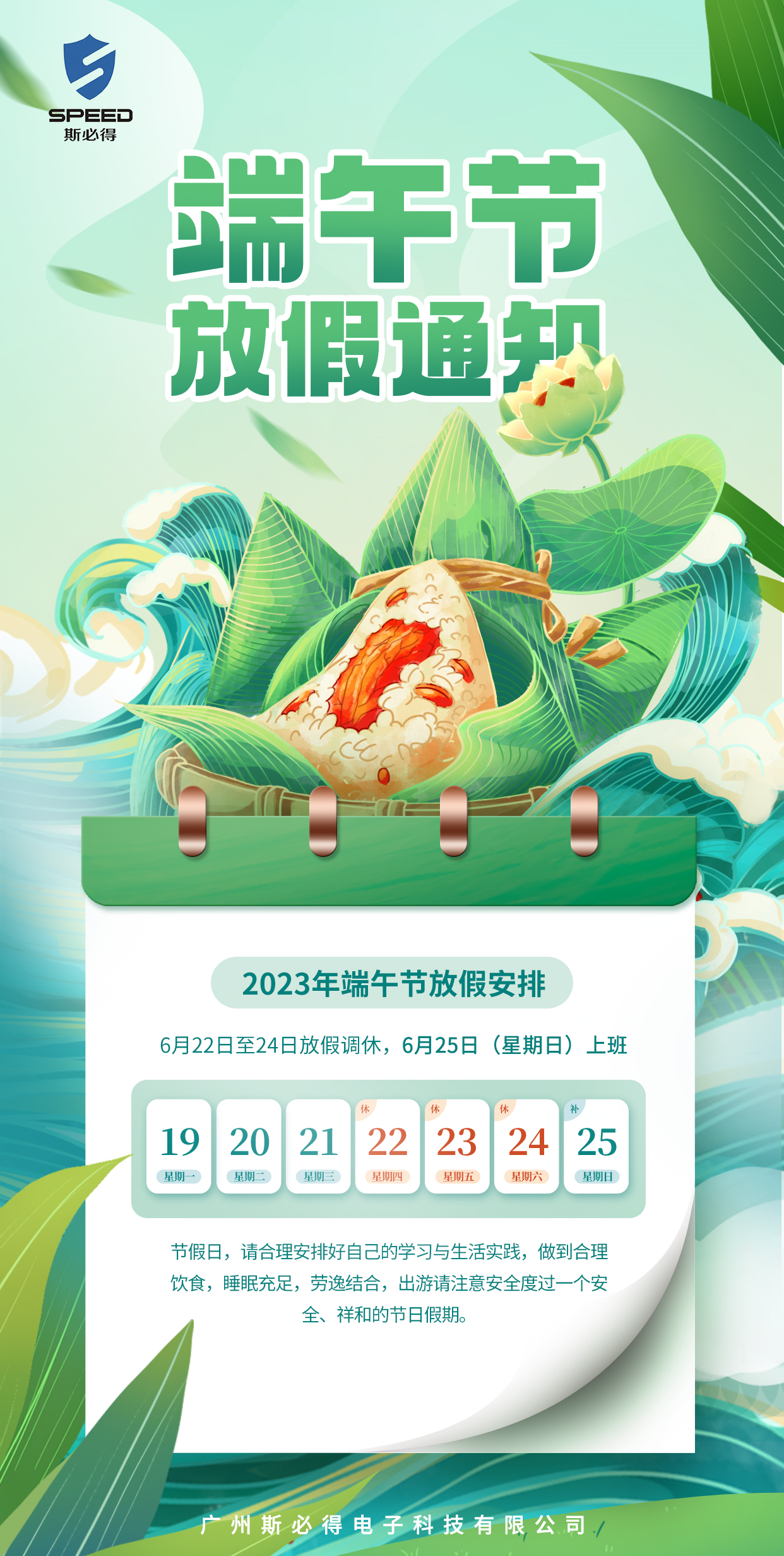 端午節(jié)是我國傳統(tǒng)節(jié)日之一,集拜神祭祖、祈福辟邪、歡慶娛樂和飲食為一體的民俗大節(jié),根據(jù)我國法定假期的相關規(guī)定,結合公司實際運營情況,對2023年端午節(jié)作以下調休放假安排:
