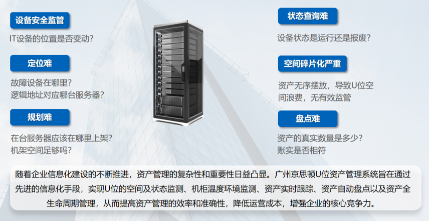 廣州斯必得U位資產(chǎn)管理系統(tǒng)通過先進(jìn)的技術(shù)手段和管理理念,實(shí)現(xiàn)了對(duì)U位空間和狀態(tài)、機(jī)柜溫度環(huán)境、資產(chǎn)實(shí)時(shí)跟蹤、自動(dòng)盤點(diǎn)以及全生命周期的全面管理。該系統(tǒng)的實(shí)施將有效提升企業(yè)的資產(chǎn)管理水平,降低運(yùn)營成本,增強(qiáng)企業(yè)的競(jìng)爭(zhēng)力。