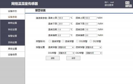 用戶在該頁面可以設置溫度、濕度上下限報警閾值、報警回差值,用戶可以自由選擇是否開啟報警以及報警觸發(fā)條件,同時在該頁面用戶可以選擇報警是否需要聯(lián)動繼電器,如果選擇聯(lián)動,那么報警觸發(fā)時,繼電器將會工作。
